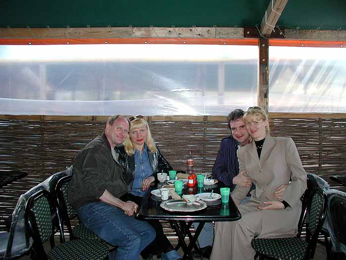 friends, Bern and his wife. Bern and I have Shaslik of lamb cooked over an open fire, it's delicious. Marina and Bern's wife have Shaslik of pork. Also, we have rice and bread. Before we head back down, we decide to all meet again that evening and have a late dinner at a restaurant on the boardwalk - this time in an actual wooden ship that was raised out of the water about 80 years ago, and has been serving as a restaurant ever since - it's a really interesting restaurant. Bern gives me his business card, and invites Marina and I to visit their home in Sweden. Who knows? Perhaps one day we will. I am sending Bern some of these emails, as I promised I would. Okay, well that's all for this chapter. There's still more good stuff to come - there's the other castle of the Romanoff's that you haven't seen yet, and more! Cya - Steve. |