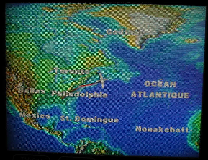 Then I transfer to an Air France airliner - here is the "TV-screen" as we begin the trip over the Atlantic. I met several French people, who were all very polite and cheerful.
