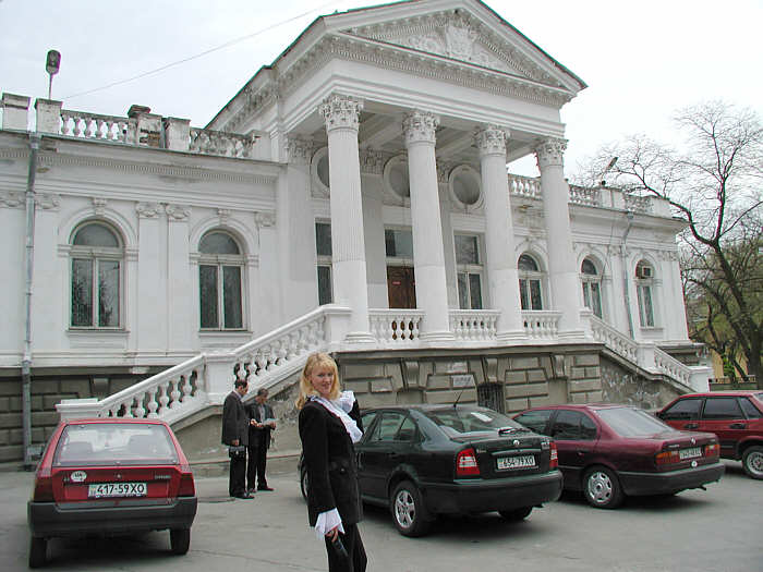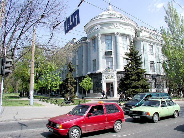 I asked Marina about Lenin, and she told me much. I asked her about Stalin, and she said that every statue and monument of Stalin had been destroyed - every one in Ukraine. She would not speak much about Stalin. Marina likes very much to learn about history. She told me about how the German people felt about the "Great War" (World War 2), and how the common soldiers fought for what they were told was good, and how that when they came home from the war, most everything they knew in their country was destroyed. All their homes were gone, like dust, and their cities were blasted to smithereens, and these German soldiers had fought for their country as good soldiers, and they returned to a Germany that was destroyed, and their lives were destroyed, and they did not know why, because their leaders had not told them the truth. I told Marina that German Leaders knew very well what they were doing, and she said, "Yes, the leaders knew, but the common soldier, even if he was German, did not know of all this. He only knew what he was told." I told Marina "Stalin killed as many of his own people as did the Germans - if he had not decimated his own army with his purges, then he would have defeated the German attack with much less difficulty." Marina did not want to talk about Stalin, I think. If you meet with Marina later, I think it might be best to not talk much about Stalin. I am not a history expert, especially when it comes to Soviet history. However, from the little bit I know, this seems to me to be the basic Soviet strategy - throw bodies at the problem -- however many bodies it takes, however long it takes, throw more and more bodies at it. This is just my own feeling, and I did not discuss it with Marina. It is not necessarily a bad strategy, but it is expensive in bodies. I did not learn anything on this trip which makes me feel differently. As we walked about the town, we saw the Naval Academy.