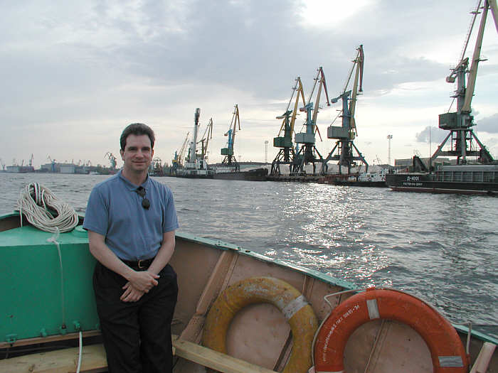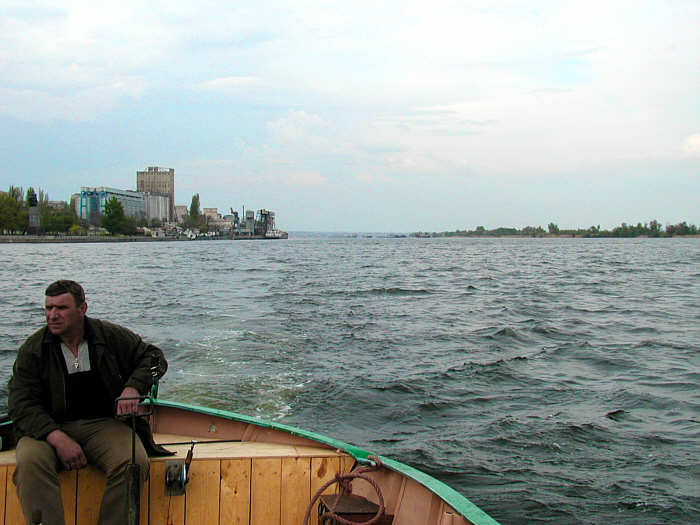 After spending several hours walking through the park, Marina takes me to the Dneiper River. This very large river leads to the Black Sea. There is much industry in the town involved with the river - dredging sand for concrete, shipbuilding, and many other things. Perhaps the Dneiper River brings the most commerce to the city. The Tennessee River is large, yes. But the Dneiper River is about 10 times larger - it is an awesome river-- to me, it was almost like a sea. It dominates the landscape. It is huge. I told Marina I wanted to go on a boat. She talked with a sailor, and he agreed to take us on his skiff (We had to pay him about 2 dollars, but he wanted the money - everyone in Kherson tries to make extra money :-) I did not say anything - if a person hears that you speak English, then the price will go up about 4 or 5 times the usual amount :-) So, Marina talks to the sailor and we get to ride on his skiff for about 2 dollars. American Money in Kherson is great! You turn in one dollar, and you get five "Grivneys" -- and a grivney buys you about 1 or 2 dollars worth of stuff. Cool! So, if I go to the bank and change 20 US dollars into Grivneys, then I get about 100 or 200 dollars worth of money! Just multiply your money by about 5 or 10 times. It's too cool! They love US dollars here! Imagine going to the best restaurant in town, having the finest food, and then you only pay a tiny amount! American Dollars are great!!!!!! I brought back 2 Grivneys (Ukraine dollars) as souvenirs. When we rode in a taxi, Marina got angry when I gave the driver a 40 cent tip. She said "You tip far too much money - do not ever give so much again for a tip! No one ever pays so much for a tip!" If you want $1,000 in buying