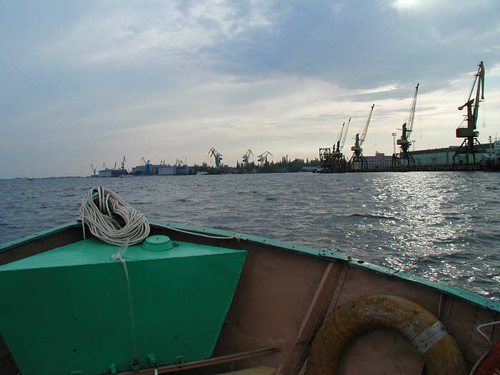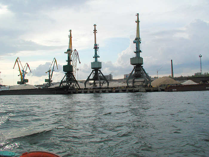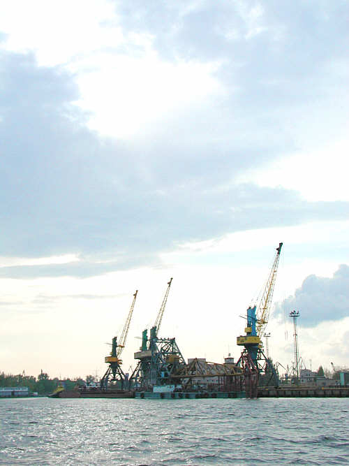 He didn't care where we wanted to go, he liked the Gryvneys we gave him, and he was most polite. Everyone in Kherson was polite, the Soviet people seem to make an art of being polite. I think it is an important part of their lives, and they practice politeness in all matters. A very nice custom, I think. Taking passengers on a river ride, this was not his normal job. He told us that he usually takes sailors to their boats, and often this takes many hours for each trip. Hmm... He looks pretty tough --- Maybe I could take him out, maybe not. If I whacked his throat first then maybe he would go down, I don't know. So, I decide "This is vacation, lets have fun and not start a fight with the sailor". But, I think I could beat the crap out of this Soviet Sailor - First, hit his throat three times (if he can't breathe, he can't fight), then pound his liver. Do you agree? How would you take him out? The Concrete factory is a very good place to work, Marina tells me - good pay and such. Don't you wish you worked there? It's on the Dneiper river. This is the concrete factory.