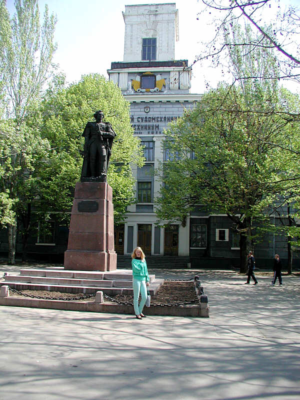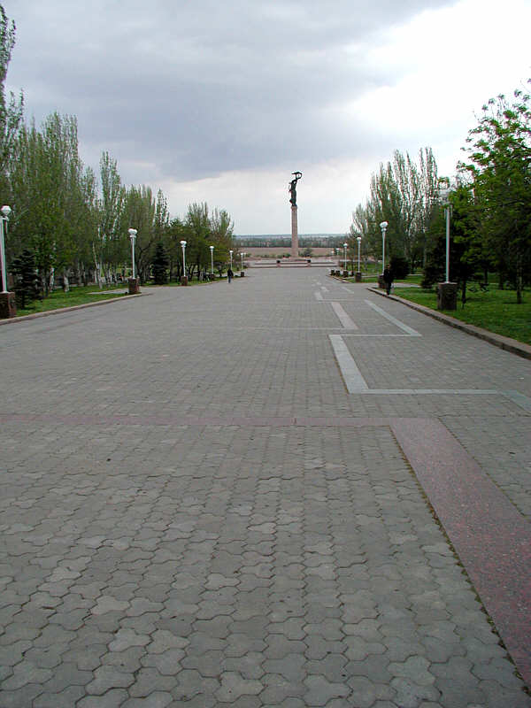 It's worth the wait. Yalta is great!!!!!!!!!!!!!! We leave the apartment this morning, and as always, walk by the KGB office. Then we go into Lenin Park again, to parts we have not been in before. Kherson has about 450 thousand people. Lenin Park is very large, as I have said, and it is in the center of the city. Yesterday we walked for about four hours in Lenin Park, and we only saw a small part of it. I tell Marina, "This park is so large - it has lakes, forests, and it is huge." Marina tells me there are much larger parks in other cities, cities with more people than Kherson. She is surprised that I find the park so large, but she has always lived here and grew up here, so it is normal to her. Here is a monument to all the mothers who lost sons in the Great Patriotic War (World War Two). I think it is about 80 feet high, a statue of a woman weeping, holding a funeral wreath above her head.