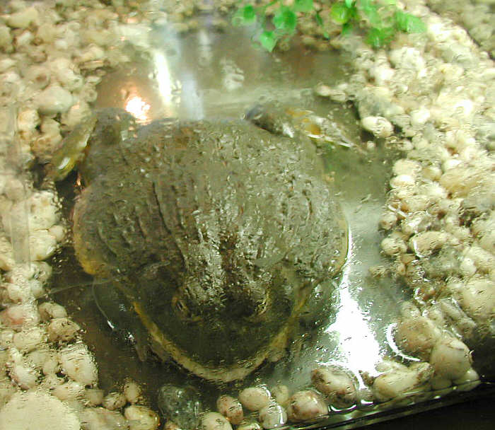 This is some kind of African frog. You can't tell his size from the photo, but he is HUGE HUGE HUGE!!!!! He is as large as a dinner plate! If you laid a one-foot ruler on him, it would just about go from one side to the other! Really, you have got to see this frog for real, to understand. Just imagine the warts you would get if you kissed this baby :-)