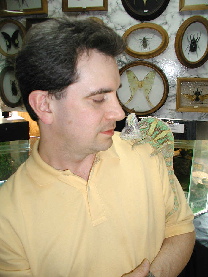 After Lenin Park (no, we did not see it all - still just a little bit of it) we went to another place where they have an animal exhibition - Kherson does not have a zoo, but they do have this traveling exhibition - it goes to many cities, and right now it is in Kherson. They have some cool animals - some of which I have never seen before, some I have only seen on TV, and some I already have seen. Here's a Chameleon - a big one, I think. He (she???? how do you tell? I don't know!) has claws and he pinches them into my shirt and skin, it kind of feels like cat's claws.