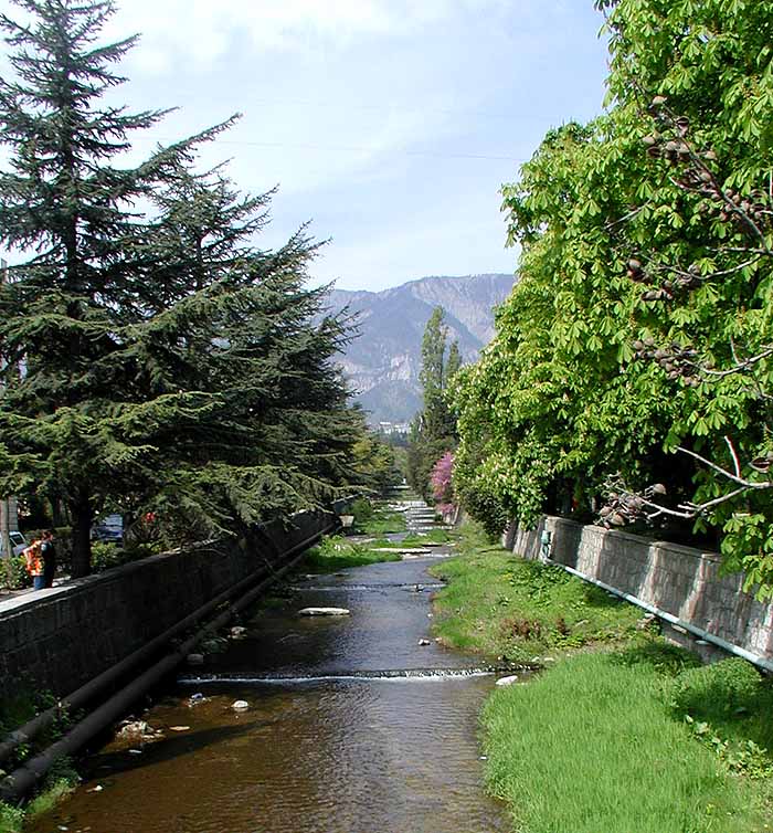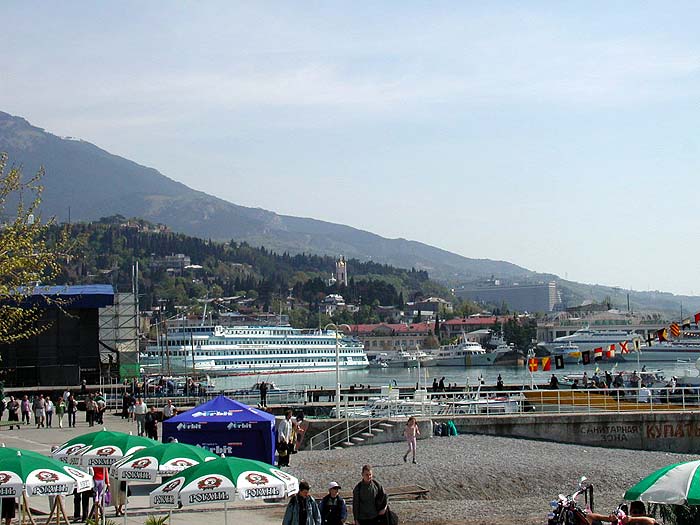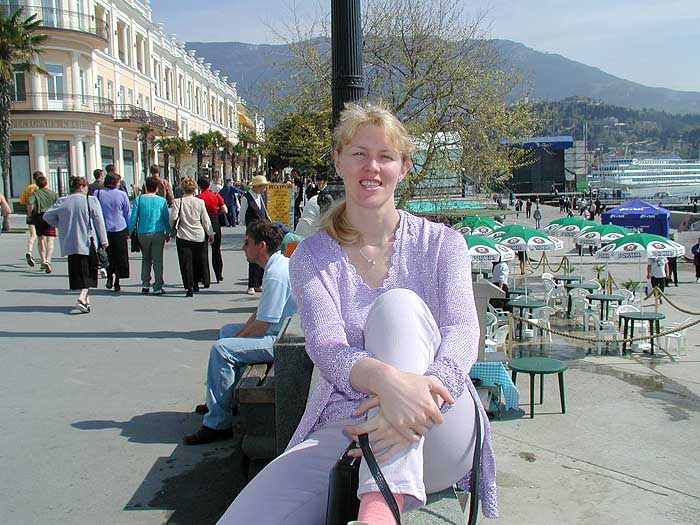 there is so much to do! Here's Marina on the boardwalk. We decide to become the rulers of Yalta :-) We walk to town, and pass a small river that runs through the middle