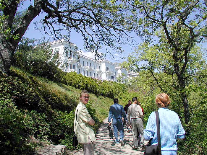 one of the rooms. There are many, many rooms iin this castle. Next we go outside. We walk by two more castles that are right next to this one - one for the "Cheif of Staff" for the Romanoff's, who arranged all their meetings, etc., and then a visitors castle. We walk behind the visitor's castle on a path to the gardens. Here's Marina with part of