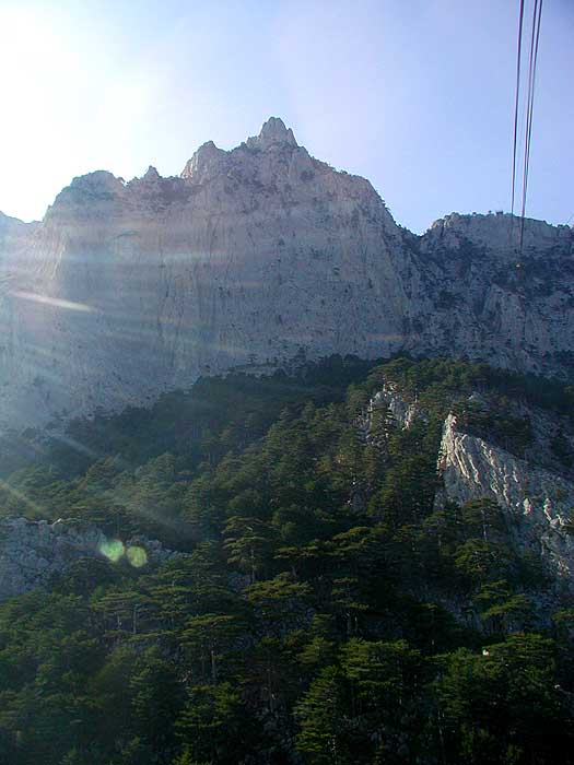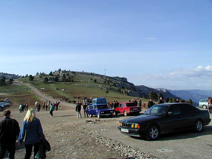 from two miles up! (It's really creepy to look straight down!!!) Maybe you noticed that in the above photos, there is a peak that is even much higher than the top of the cable car station. We come back in two days and we hike up there. I did not take my regular camera up there - Instead, I took my video camera. It was so high, the hike was so steep. At the very top it was fantastic, you have to be there to understand. I went all the way to the very top of the rocky crag peak - Marina got close, but would not come to the very top. The rocks got very slippery at the top, and I sort of sat down and "crab-walked" on all fours for the last part - it was very slippery. I haven't looked at my video tape yet, but if it is good, then I might make copies and give them out! -- I think it will be very good :-) At the top of the mountain, there is sort of a plateau. There is a road that leads up here, so there are some cars (on our second trip up here, we take the road back down - it is a horrible road, huge pot-holes, extremely tight turns, and there is a stone wall on the side of the road to stop cars from going off the edge - only the stones have been knocked away in dozens of places, and I don't mean a stone or two missing here or there - I mean the stone wall is totally destroyed for 10 or 20 feet in lots of places. Now, I think to myself, what knocked the stone wall down? It wasn't someone running their bicycle into the stone wall - no sir, I don't think that's what did it. I think that vehicles knocked the stone wall down (as they crashed through the wall!!!). The pot-holes are so bad, the bus nearly tips over just from them. Here's a photo of the plateau