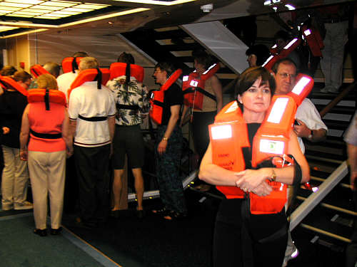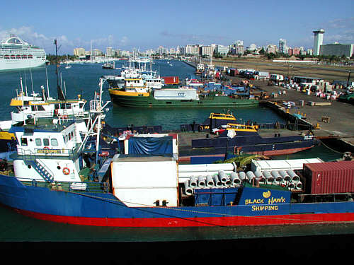 We walked around the ship and saw some places - more about those later. The San Juan (Puerto Rico) harbor wasn't too interesting - it was mostly industrial / cargo stuff. (Hint - the good places are coming up - you will see them later - this was just day one, and most of the day was already gone by the time we got to the ship - there are lots more days :-) Here's a shot from the back of our ship at San Juan Harbor. You can see that we are well above all of the other ships, except that other cruise liner to the left. And we were only on Deck Six. There were 13 decks you could walk on, the ship went lots higher than that (but no passengers allowed!).