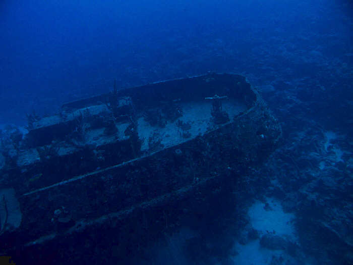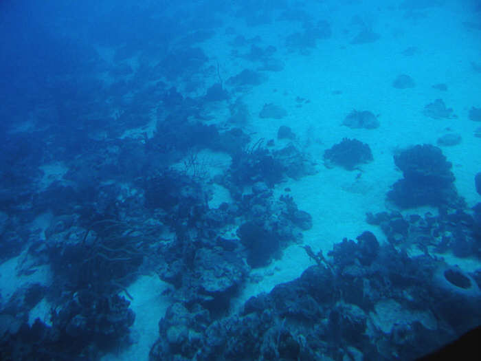 ----- Next, we passed beyond the reef, into the regular sandy-bottom ocean. Look at that giant round sponge near the lower right.