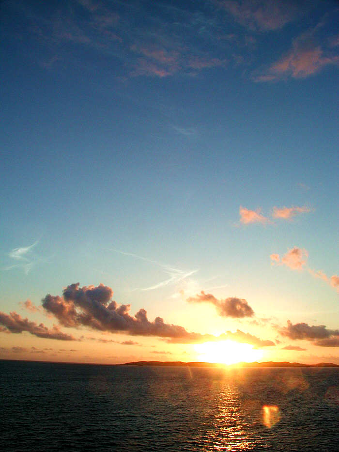 Greetings, all. This was the seventh day, we visited Saint Thomas. This was the ritzy-est of all the islands. I think some rich people live here. I got up early to watch the sunrise (not many people got up that early on the cruise). You can see the island off in the distance.
