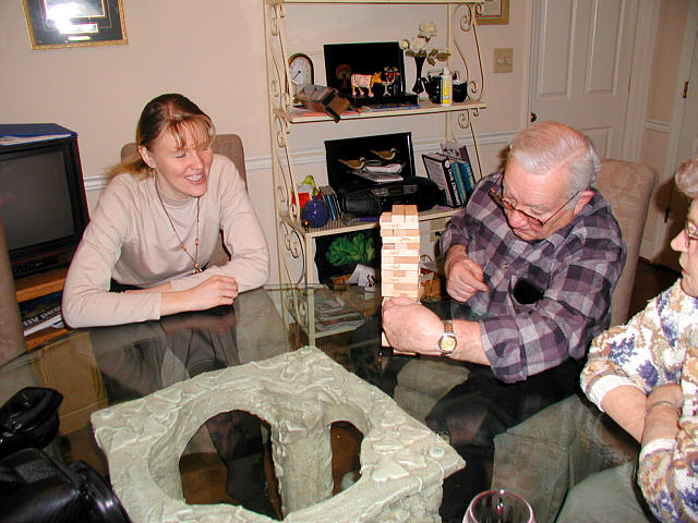 Hi, Everyone -- My sister, Laura Morris, and her husband Steve Morris, invited Marina and I to visit her at her new home in Nashville - the capital city of the state (province) of Tennessee in South East USA. This is about 200 miles (360 kilometers) from home. This will be fun, because we will celebrate 2 birthdays - Laura Morris (my sister) and Marina Capps (nee Chedakina) my wife. Before we go to visit Laura, we have dinner with Ron and Dottie Lamb ( my mother and her husband ). We do this every week. We do lot's of fun things, one of these is to play Jinga, a game where you build a tower of wood pieces. Then, the game is, you must remove a wood piece, again and again and again, until the tower falls. If you remove a wood piece, and the tower does not fall, you win :-) If you remove a piece and the tower falls, you lose -- too bad :-( Here we are playing Jinga.