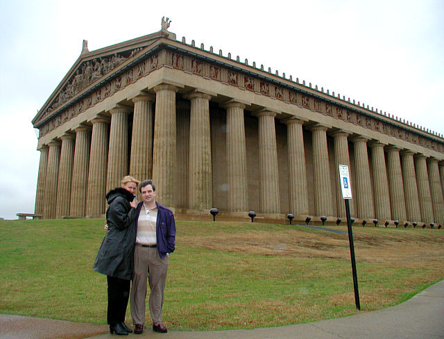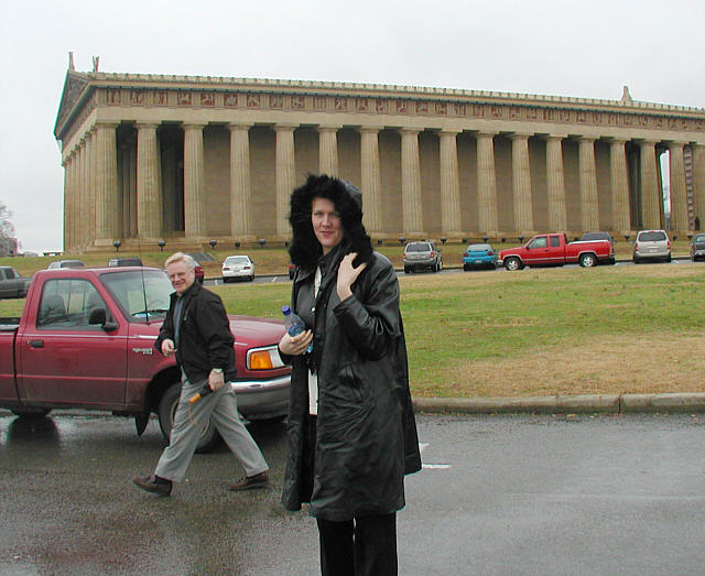 We walked around the hotel for a few hours and had lunch at a great restaurant inside. There were trees and waterfalls and forests all around us the whole time -- and we were inside! It was too cool. One day I want to come to this hotel and stay there for a few days. Next, we go to the Parthenon. I went there when I was very young, maybe 9 years old or so, I don't remember exactly. The Parthenon is a replica of the Parthenon in Greece. It is a huge building, made over 100 years ago for the World's Fair in 1892, or very close to that - I am not sure which year the fair was. In any event, it was over 100 years ago. -- In metric measurements, that's over 100 years ago :-) Here we are arriving, it was a bit cold, because it is still February, and the wind was really blowing. The building is HUGE, and very impressive. This is not like the memory I had from a child, this is really a monument. I am impressed. Seeing this building is different from photographs.