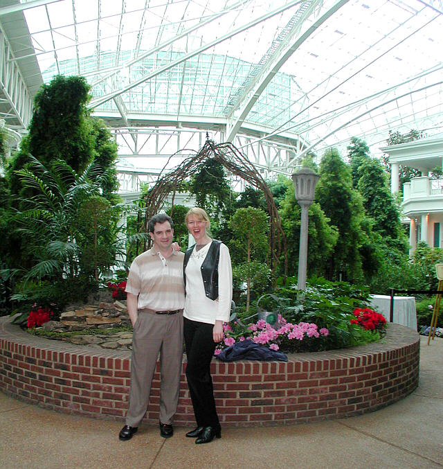 One of the things we did on this trip was to go to the Opryland Hotel. This is the largest hotel in the world. It is huge, It has a tremendous glass dome that covers several indoor tropical forest areas. Inside the tropical forests are restaurants, walking paths, shops, and more. It is so big. There's a lake with waterfalls, and you can take boat trips that travel the lake. The only way to really understand it is to visit it. Here is Marina and me, and you can see a very small, tiny little bit of the enormous glass dome. Marina is so beautiful, and such a happy person. I am so glad I found her and married her.