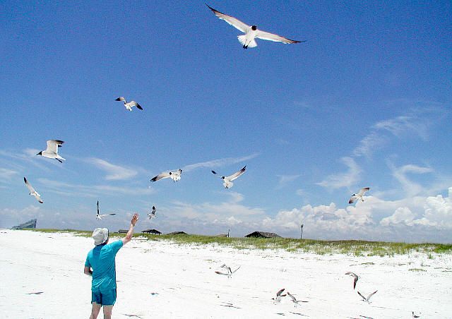 Greetings, Everyone -- One day in Pensacola, we were beaching, swimming, shell-hunting, and having fun. We had brought some potato chips along with other snacks. A whole flock of seagulls began to swarm near us, they knew we had some good food. We started throwing them some potato chips The seagulls caught them in the air, on-the-fly, and more and more and more came.