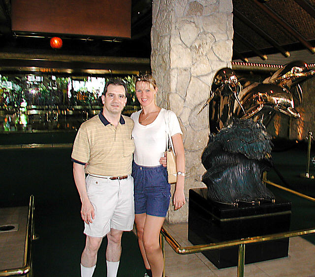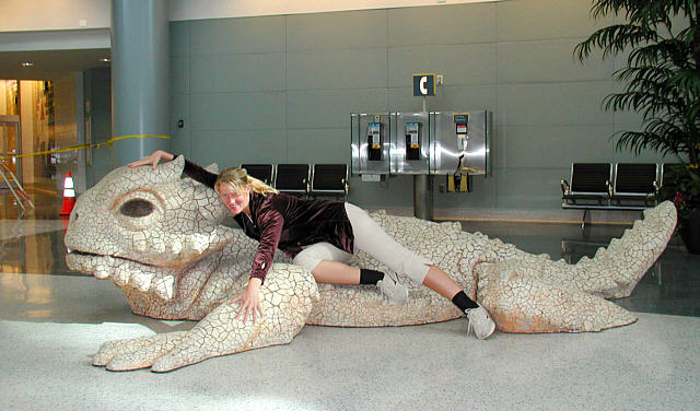 The flight to Las Vegas was fun, I had a window seat, but there were clouds much of the way. But, often you could see the desert below. For about 2 minutes there was a big break in the clouds, and you could see the Grand Canyon, which was truly huge. One day I want to visit there. We land in Las Vegas, which had a nice airport. Here's Marina with a statue in the airport. (Yes, they had slot machines inside the airport.)