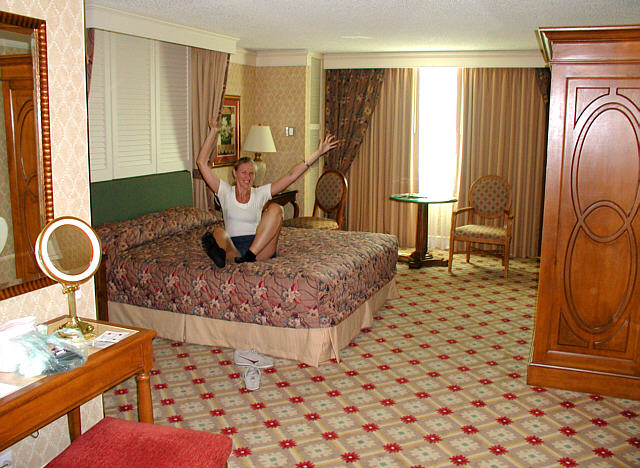 We go to Check-In, and instead of a wall behind the counter there is a huge aquarium, that goes on for tens of yards. Next, we must walk through the casino to get to the elevators. Everywhere you go, they try to make you walk beside slot machines, blackjack tables, etc. We get to the room and unpack. The room is big, the view out the window is great (we can see the "volcano" out our window) and we are excited and ready to go see Las Vegas!