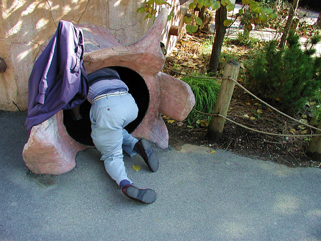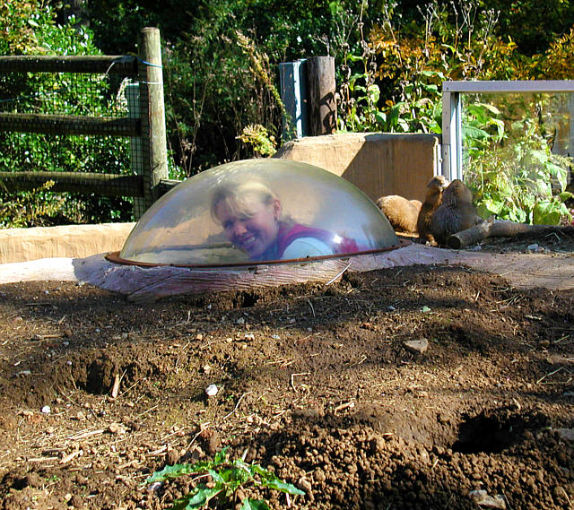 Then we head for the Prairie Dog habitat. The prairie dogs dig "caves" in the dirt, and those are their homes. They had this cave like a hollow trunk you could crawl in, and be right next to the prairie dogs - only, it was long and the floor was hard and bumpy, and it hurts on your knees!!! Let me show you how to go into the cave :-)